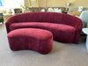 This curved sofa is comfortable and elegantly scaled. It easily fits in all shaped rooms. This mid-century design sofa features crescent shape, curved lines and sloped arm detail resulting in a must have piece.