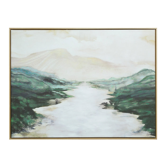 Artfully printed and featuring beautiful hand-painted embellishments, this modern landscape promises to hold the gaze of any onlooker. Set in natural hues of green and beige, this wall art painting sets the standard of the new neutrals. Completing this cotton-linen canvas is a beautifully crafted new bleached wood-finished frame that complements the look of any interior.