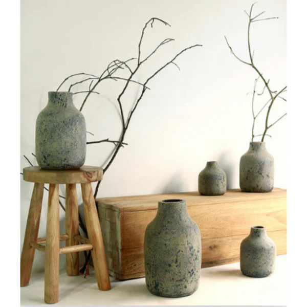 The Martha set of 5 decorative vases, handmade from terracotta, boast a distressed and vintage look that gives them a unique charm. Each of these vases is the result of craftsmanship, highlighting the authenticity and beauty of terracotta. The aged patina and shades of color are reminiscent of objects found at flea markets of yesteryear, adding a touch of rustic elegance to any interior. These pieces, varying in shape and size, can be arranged together to create a captivating focal point in a room, or separately to add visual interest to different spaces. The use of terracotta, a naturally durable material, also ensures that these vases will remain treasured decorative elements for years to come.